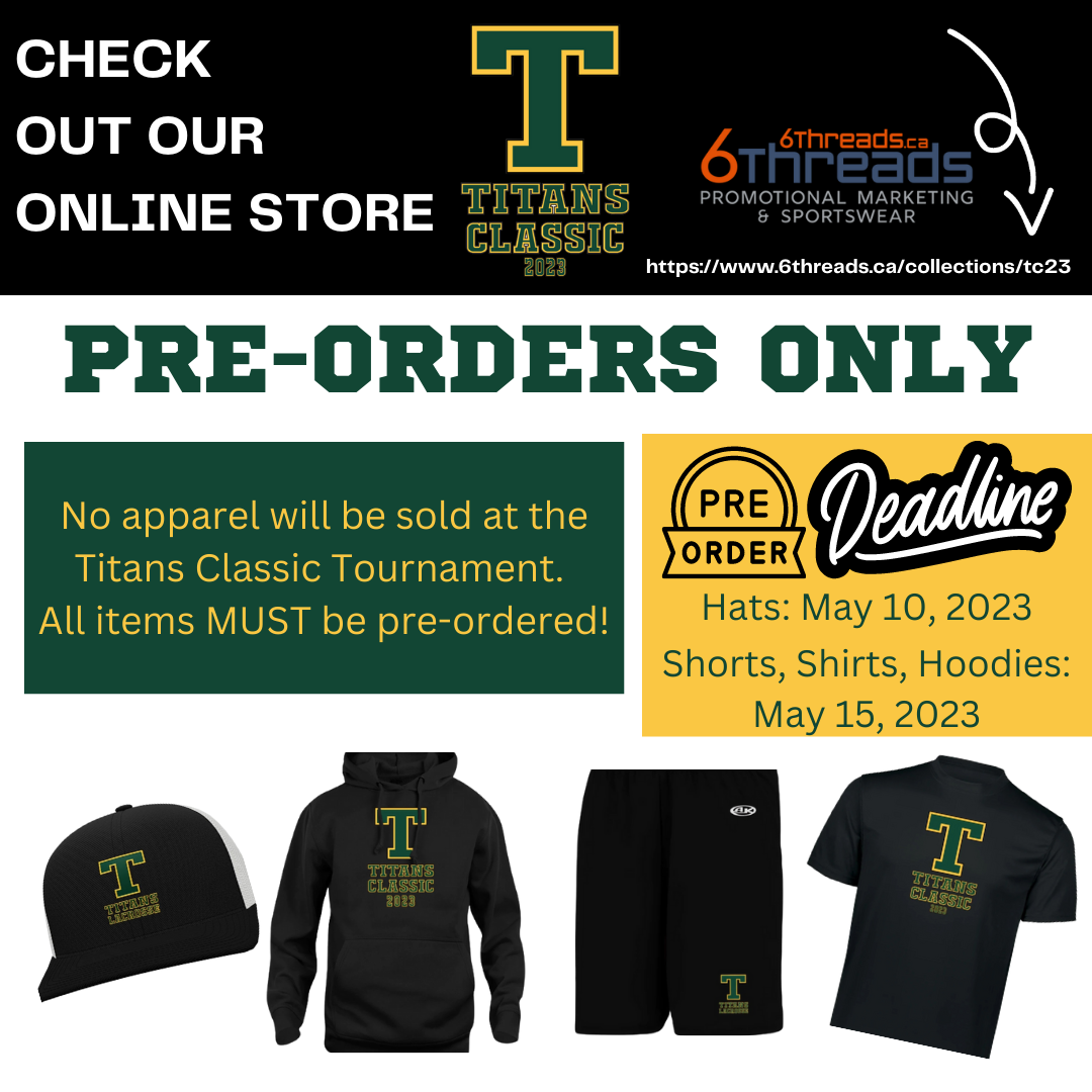 Don't miss this exciting opportunity...Titans Classic 2023 Tournament apparel, along with a few special Titans Lacrosse pieces are now available at our online store for PRE-ORDERS ONLY!